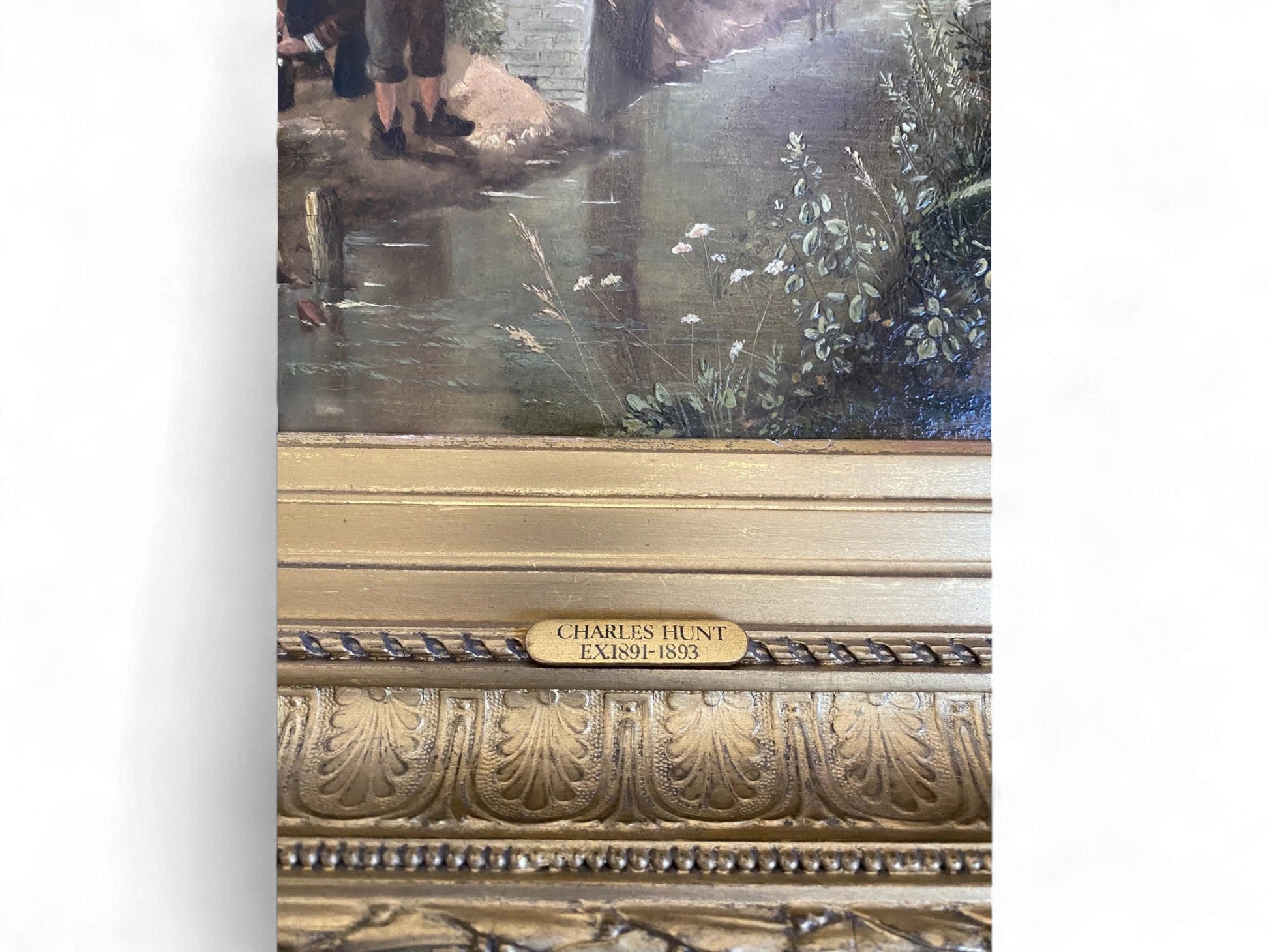 A charming Victorian oil painting by Charles Hunt, depicting a peaceful country scene with boys fishing by the water. Warm tones, gentle light, and fine detail capture the rural tranquility of the late 19th century. A beautiful original artwork that brings historical character and a touch of pastoral elegance to any interior.